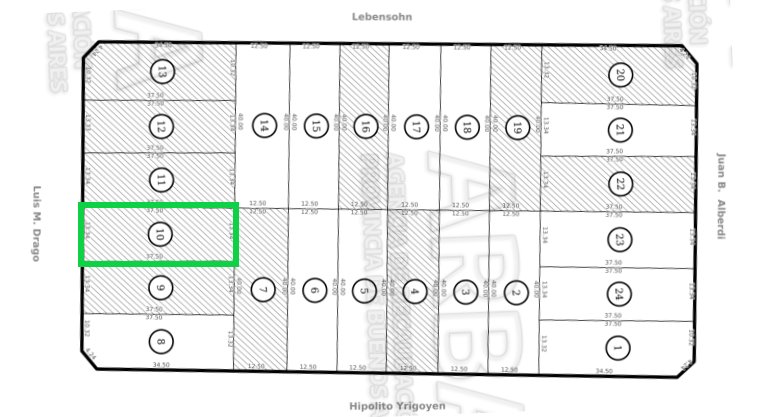 Posee medidas de 13,34 metros de frente, y 37,5 metros de fondo, lo que resulta en una superficie total de 500m2.