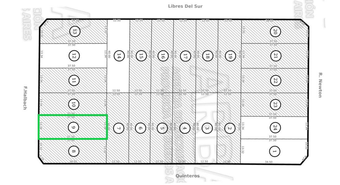 Posee una superficie de 500m2 de superficie, con medidas de 13,34 metros de frente y 37,5 metros de fondo.