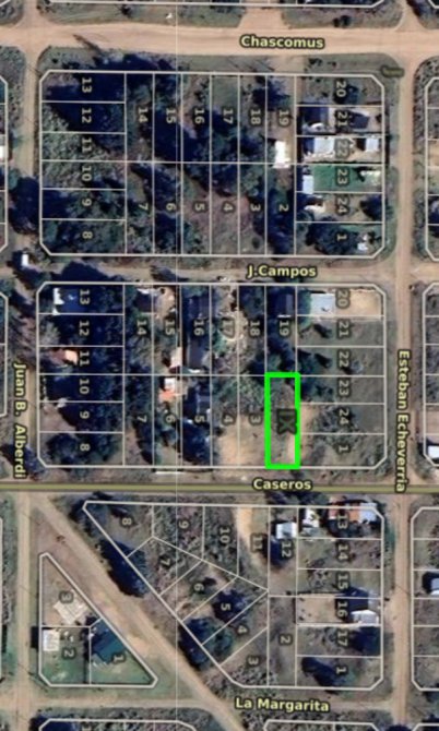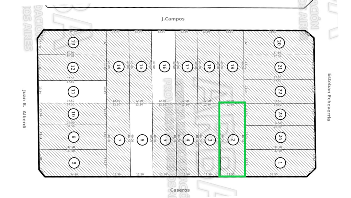 En venta lote ubicado en Caseros entre Echeverria y Alberdi, con 12,5 metros de frente al Este y 40 metros de fondo, resultando en una superficie de 500m2.