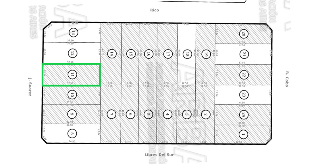 Cuenta con 500m2 de superficie, con 13,34 metros de frente al Sur y 37,5 metros de fondo.