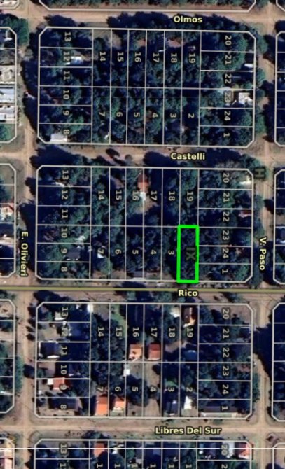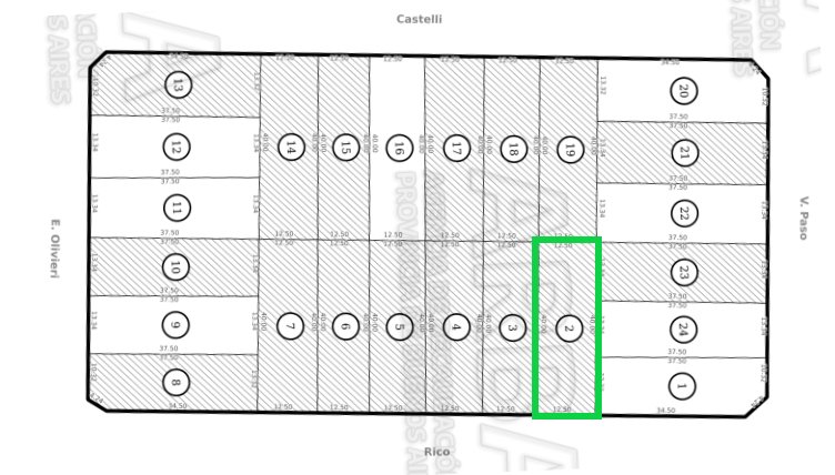 Cuenta con 12,5 metros de frente al Este y 40 metros de fondo, resultando en una superficie de 500m2.