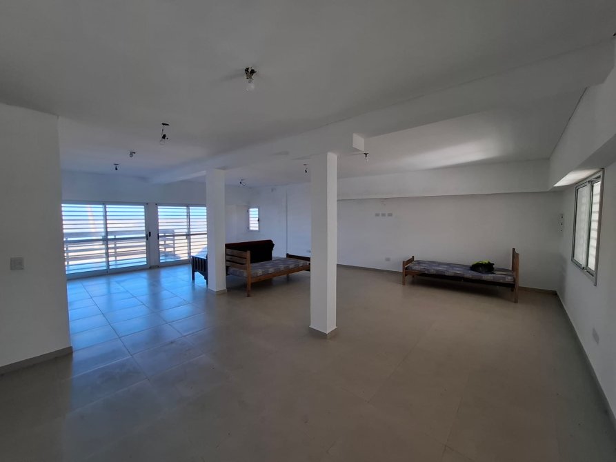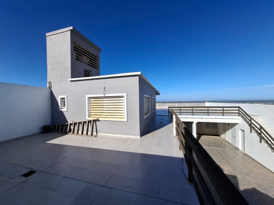 Primer piso (unidad 3): departamento de tres ambientes con living-comedor-cocina, dos dormitorios, baño y una terraza amplia con vista al mar.