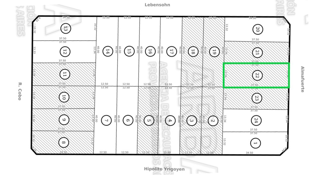 Cuenta con una superficie de 500m2, a razón de 13,34 metros de frente y 37,5 metros de fondo.