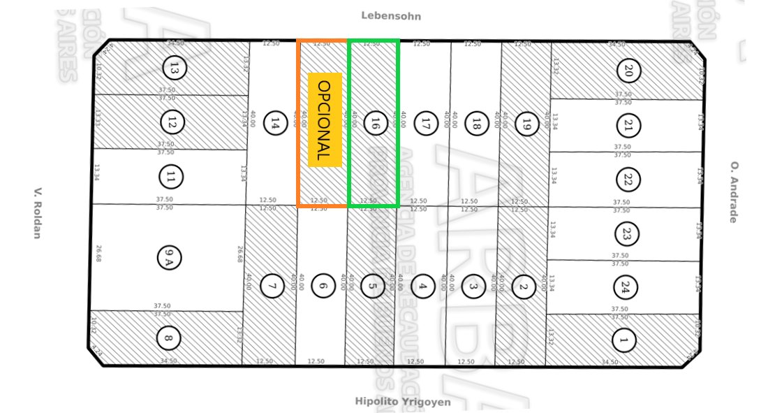 Cuenta con 500m2 de superficie, a razon de 12,5m de frente al Oeste y 40m de fondo.