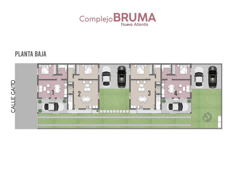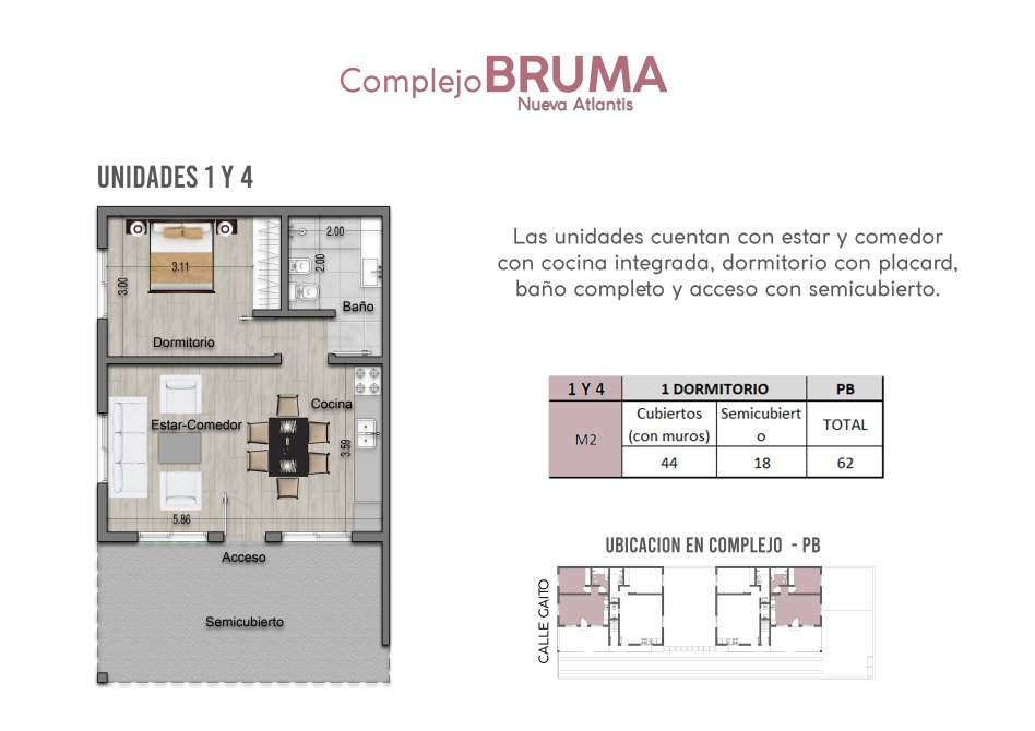 Las unidades de planta baja 1 (frente del primer bloque) y 4 (contrafrente del segundo bloque), cuentan con 44m2 cubiertos y 18m2 de galería/cochera semicubierta, con living-comedor-cocina, baño completo y dormitorio.