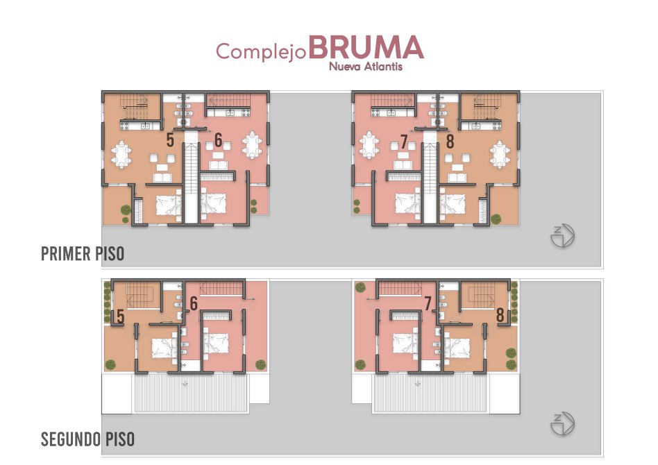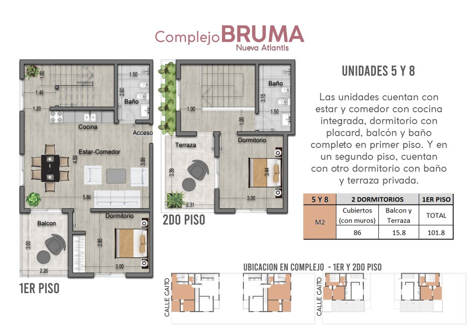 Las unidades de primer piso 5 (frente del primer bloque) y 8 (contrafrente del segundo bloque), tipo dúplex, cuentan con 86m2 cubiertos, balcón de 6,8m2 y terraza de 9m2, con una primera planta con living-comedor-cocina, baño completo, dormitorio y balcón, y segunda planta con dormitorio, baño completo y terraza privada.