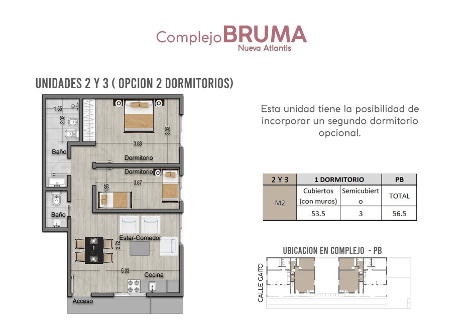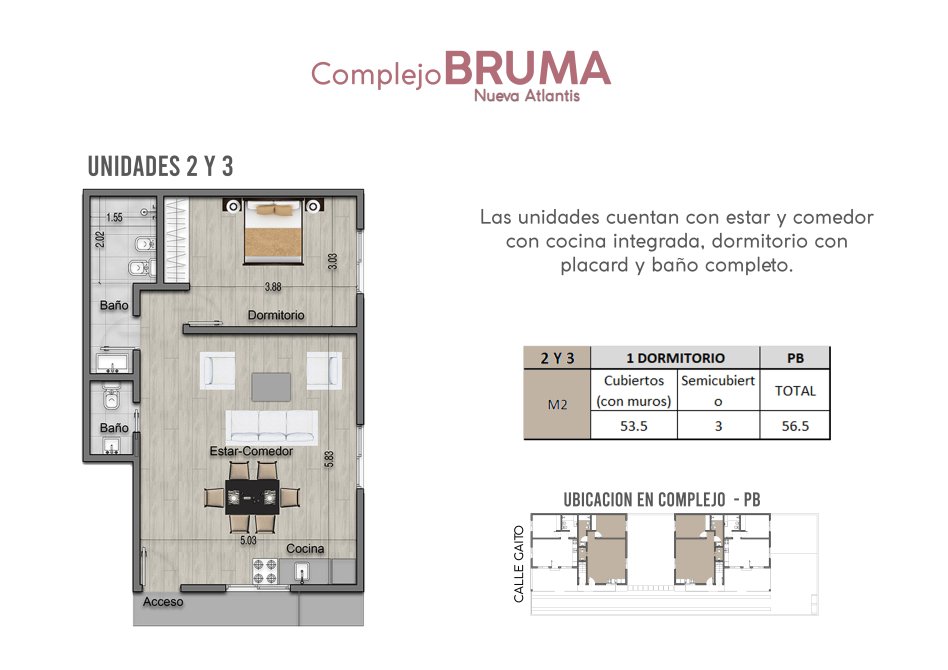 Las unidades de planta baja 2 (contrafrente del primer bloque) y 3 (frente del segundo bloque), cuentan con 53,5m2 cubiertos, 3m2 semicubiertos y 28m2 de patio/cochera, con living-comedor-cocina, baño completo, toilette, y opción a uno o dos dormitorios.