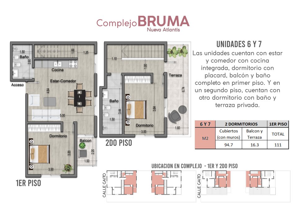 Las unidades de primer piso 6 (contrafrente del primer bloque) y 7 (frente del segundo bloque), tipo dúplex, cuenta con 95m2 cubiertos, blacón de 3,3m2 y terraza de 13m2, con mismos ambientes que las unidades 5 y 8, pero distinta distribución.
