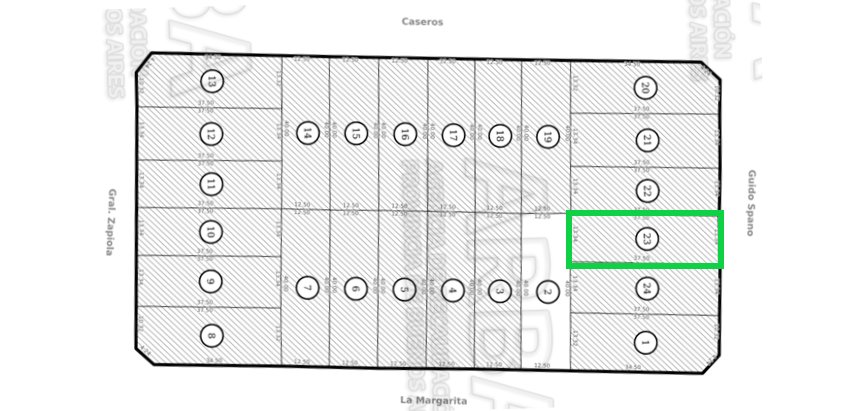 Cuenta con una superficie de 500m2, con 13,34 metros de frente al Norte y 37,5 metros de fondo, y se encuentra amojonado, alambrado y nivelado.