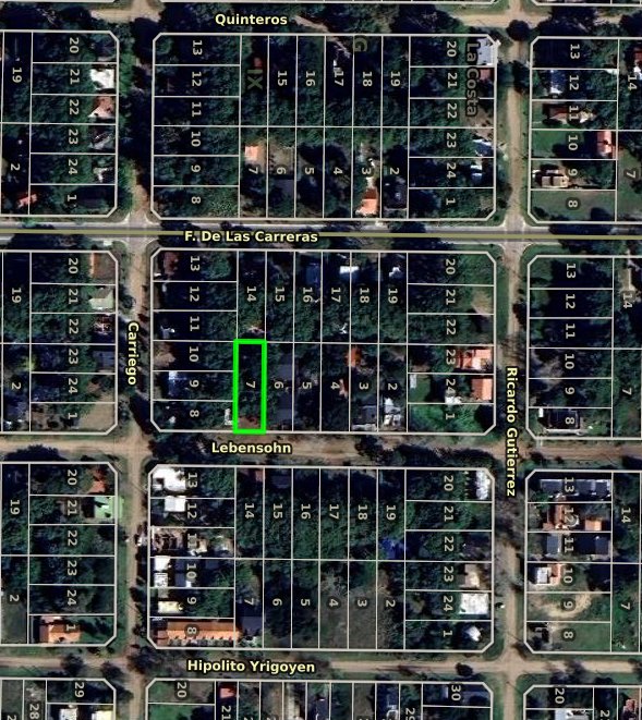 Terreno de 500 m², con 12,5 m de frente al Este por 40 m de fondo. Suelo regular y abundante forestación con pinos consolidados.