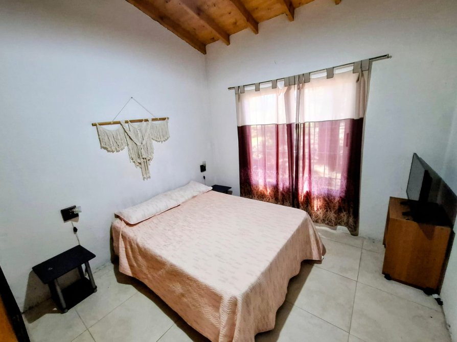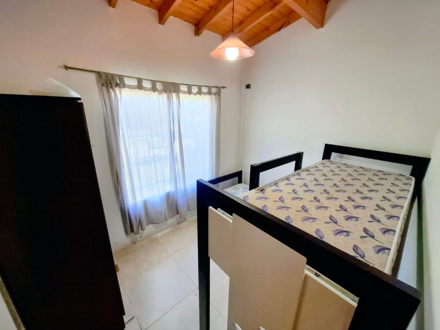La vivienda tiene aproximadamente 60 m² cubiertos más entrepiso de madera, y se compone de living-comedor-cocina integrados con bow window al frente, dos dormitorios (uno de ellos con placard) y baño completo.