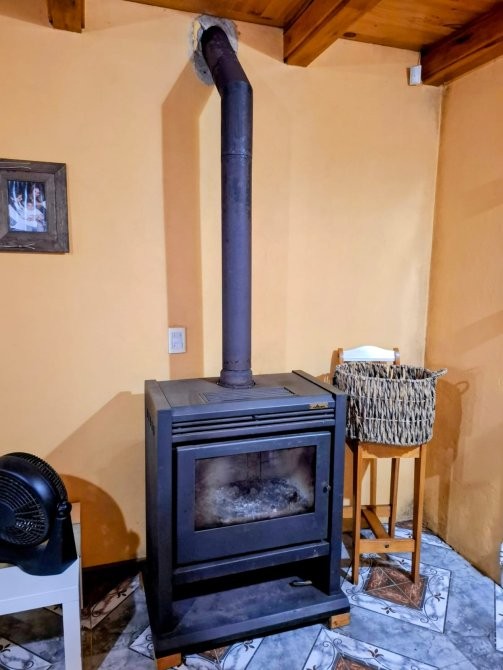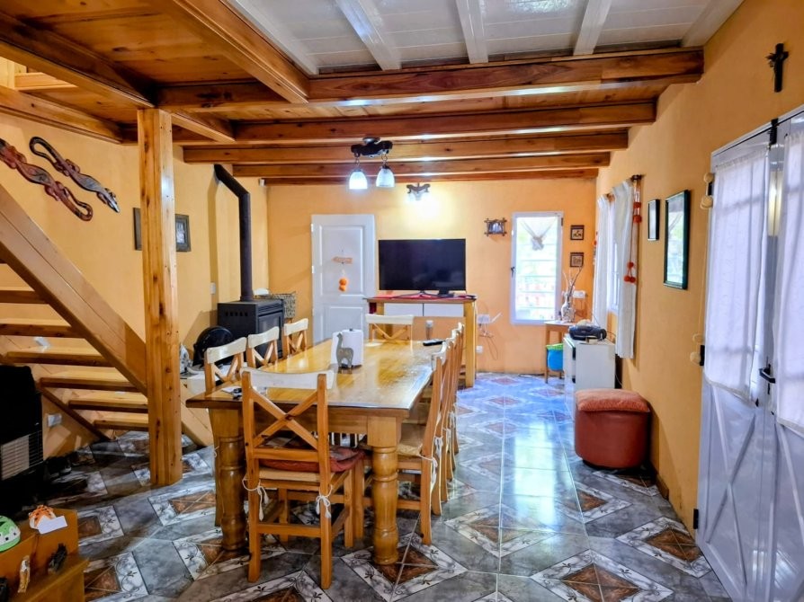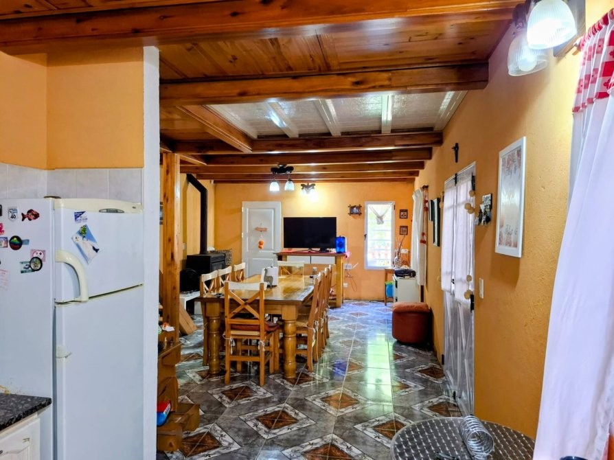 Planta baja: living–comedor–cocina integrados, baño completo y salamandra Tromen.