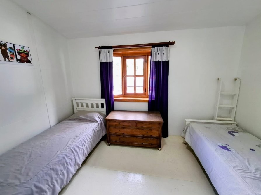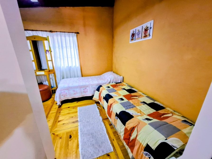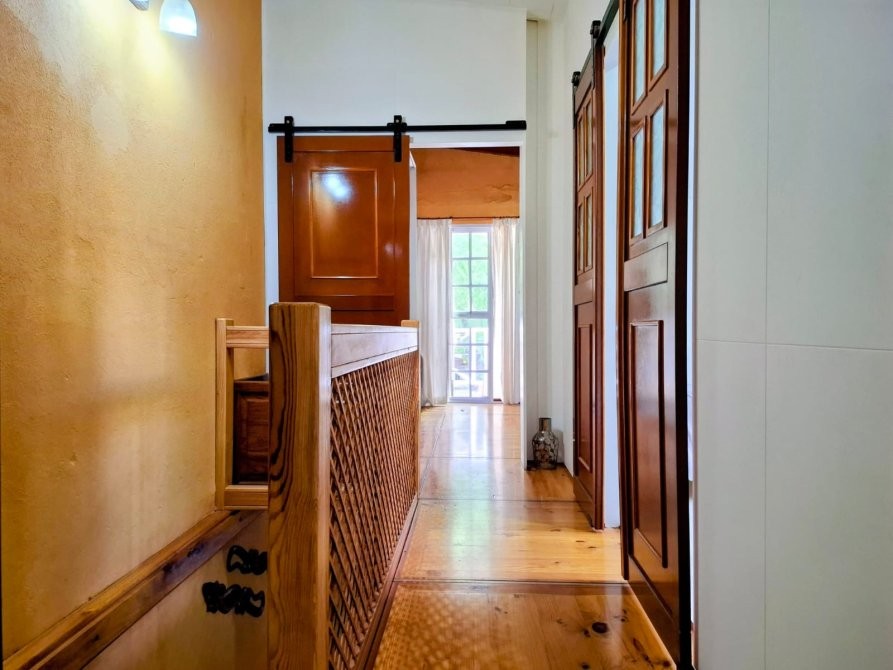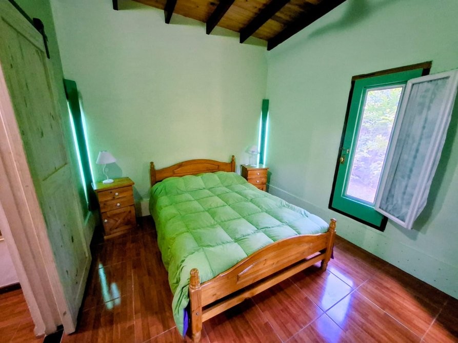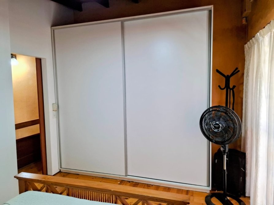 Planta alta: tres dormitorios, delimitados con placas de MDF dobles con cámara de aire; dos de ellos con placares completos en melamina, y uno con salida a balcón al frente. El piso está resuelto con baldosones de madera fabricados a medida (1 x 1 m).